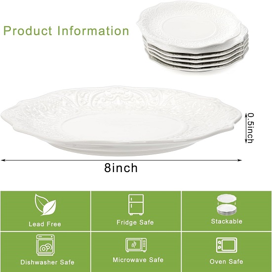 Set of 6 Salad Plate, 8 Inch Porcelain Dessert Serving Plates, Embossed Printing Small Dinner Dish for Pancakes, Steak, Microwave, Dishwasher Safe